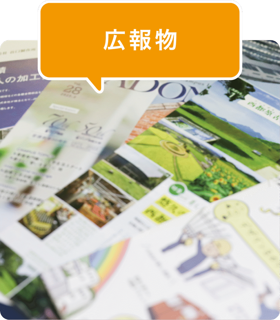 カタログや出版物といった各種印刷物から、トートバッグ・バッジ・ファイル・カレンダーなどのノベルティデザインまで、さまざまなツールの提案が可能です。
